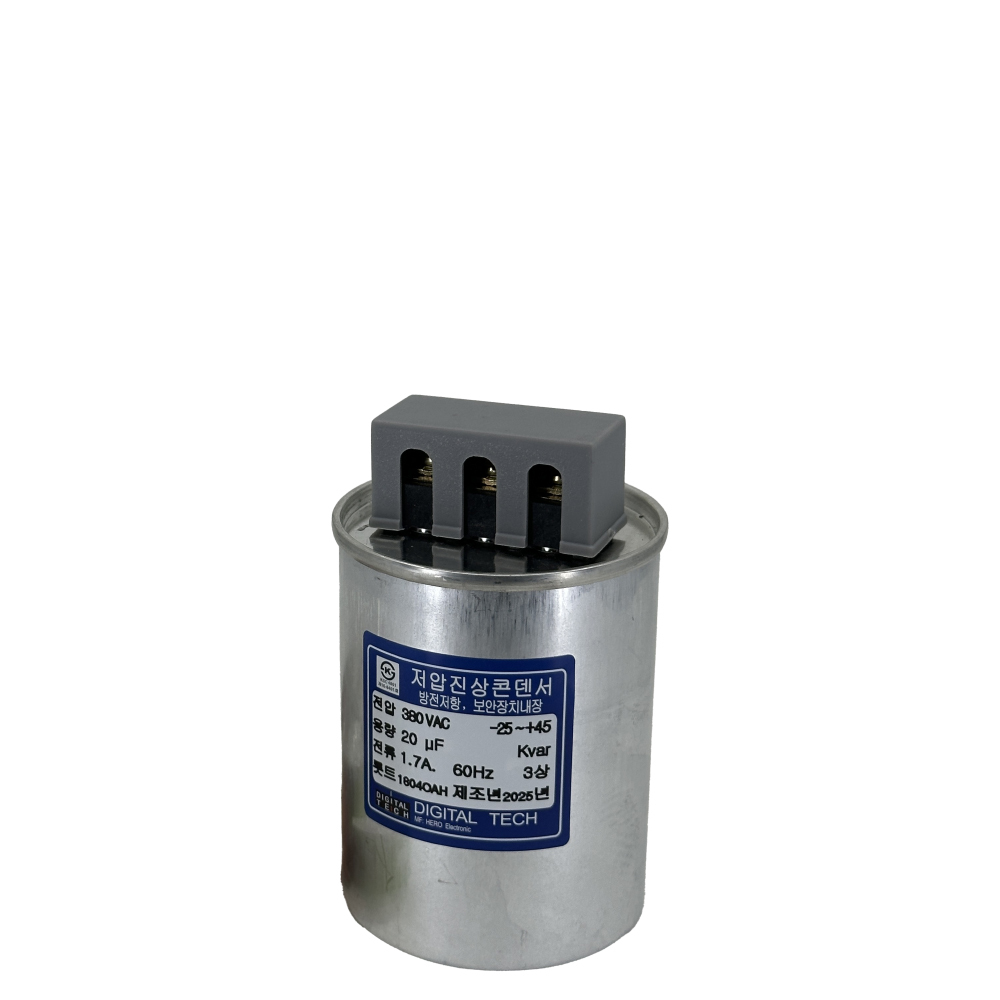 DLE-3H20T는 380V 삼상 계통에서 소용량 역률 보상에 특화된 저압 진상 콘덴서입니다. KS 및 IEC 규격을 준용하고, 압력감지형 보안장치와 방전저항을 기본 내장해 안정적인 설계를 갖추고 있습니다. 옥내용 배전반, 자동역률조정기 패널, 소규모 모터 부하 등에서 신뢰성 있는 역률 개선 솔루션을 찾는 사용자에게 적합한 선택이라 판단됩니다.