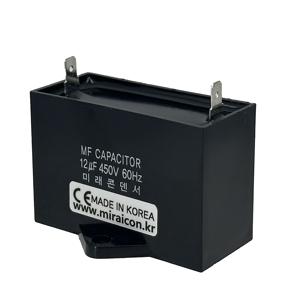 이 제품은 450VAC 정격에 12uF 용량, 사각수지 타입으로 구성됩니다. 공간이 빡빡한 장비에 넣기 좋은 형태라 교체 수요가 꾸준한 편입니다.
